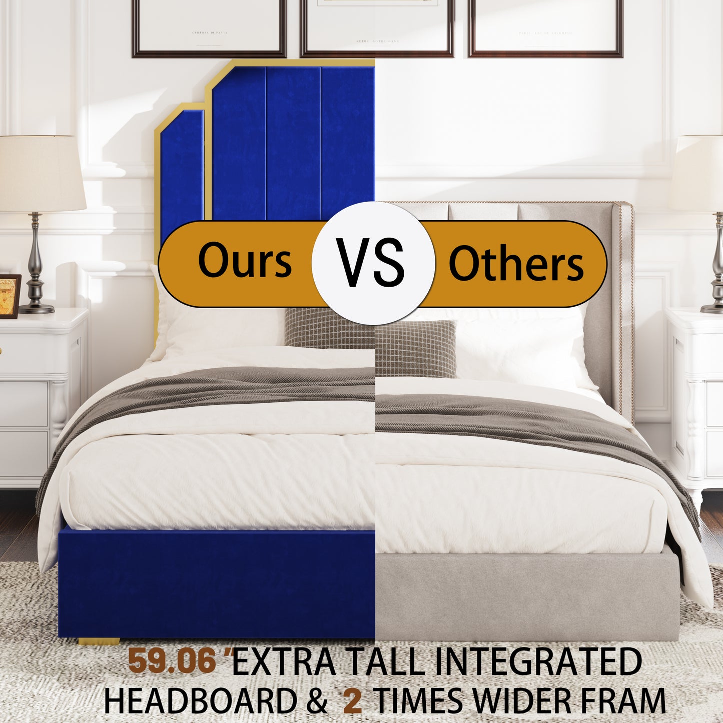 - Contemporary Queen Bed Frame with Plush Velvet Upholstery and Gold Accents: Featuring soft velvet upholstered side rails leading to a 59" vertical channel headboard, supported by elegant gold legs, this bed frame embodies modern luxury and comfort.
