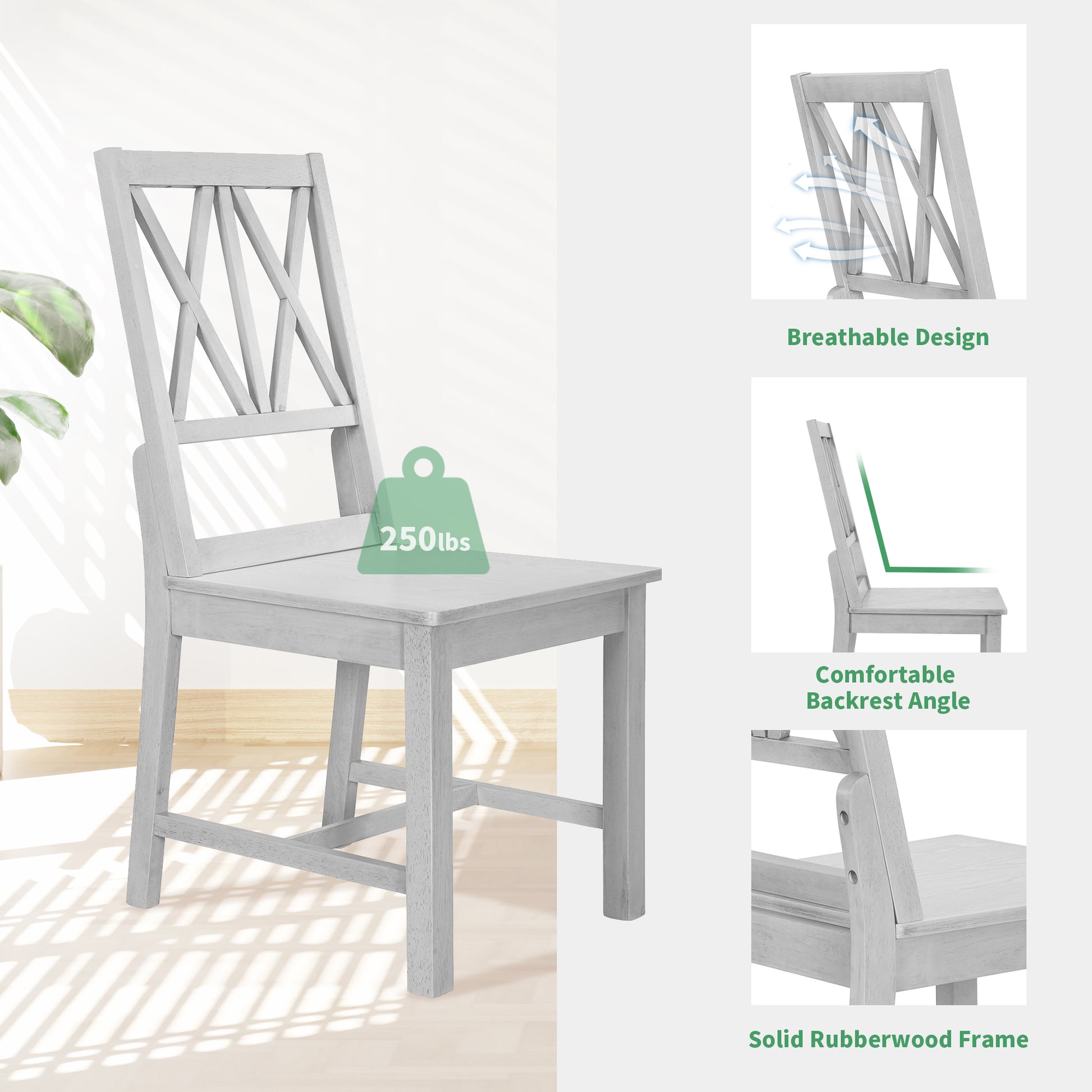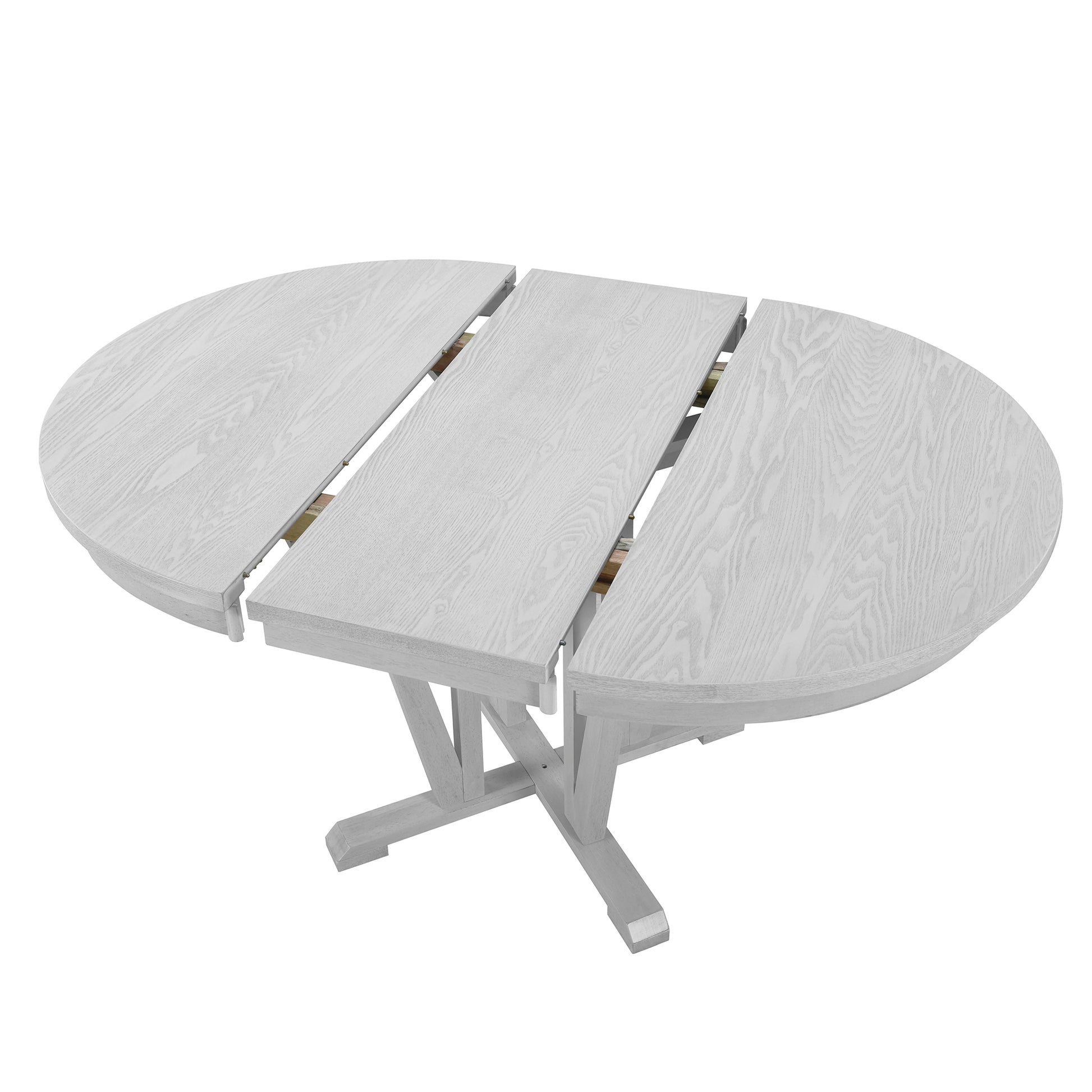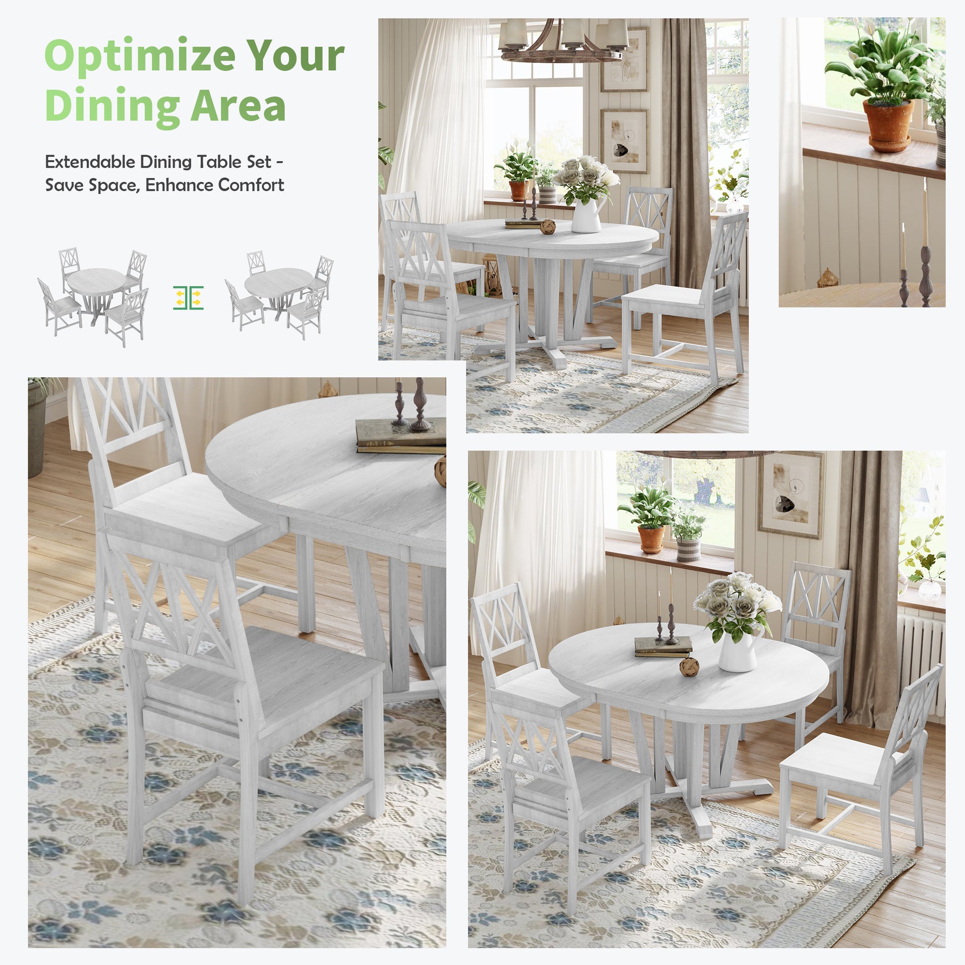 - [5-piece Dining Table Set] This 5-piece dining table set exudes elegance with its round tabletop and distinctive trestle-based legs, creating a refined and inviting atmosphere. The graceful gray wood texture adorns both the tabletop and four cross-back dining chairs, making it a perfect fit for farmhouse or modern-style dining rooms. Additionally, the extendable table adds versatility, ensuring suitability for any room size. Experience sophistication and comfort with this versatile dining set