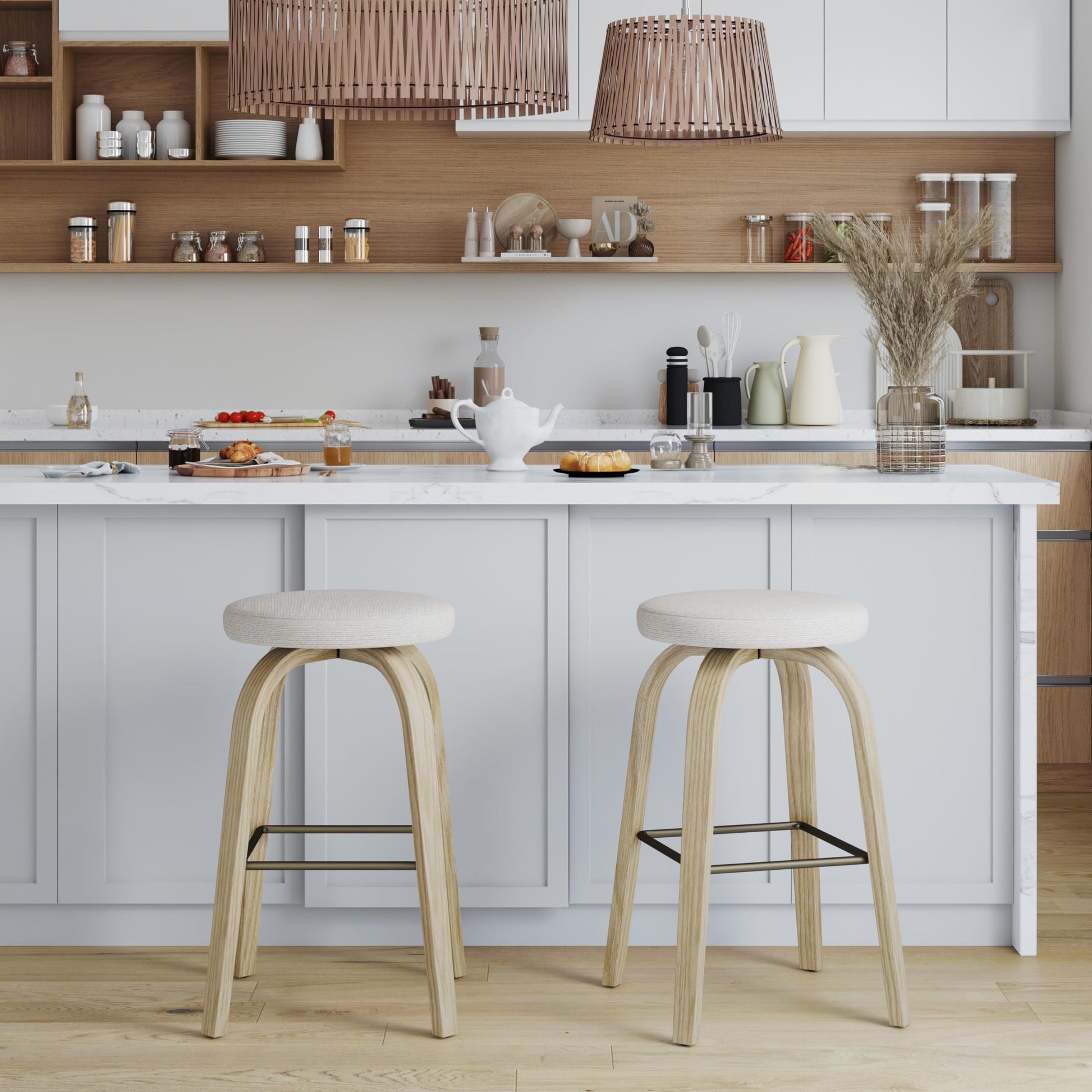 The Alden Swivel Fabric Bar Stool Set brings clean mid-century styling and everyday practicality to kitchen islands, dining areas, and home bars. Featuring a softly upholstered round seat, warm bentwood legs, and a supportive metal footrest, these stools balance comfort and modern design in a compact, space-saving silhouette. Available in black, gray, and beige, the Alden offers versatile styling to complement both contemporary and transitional interiors.