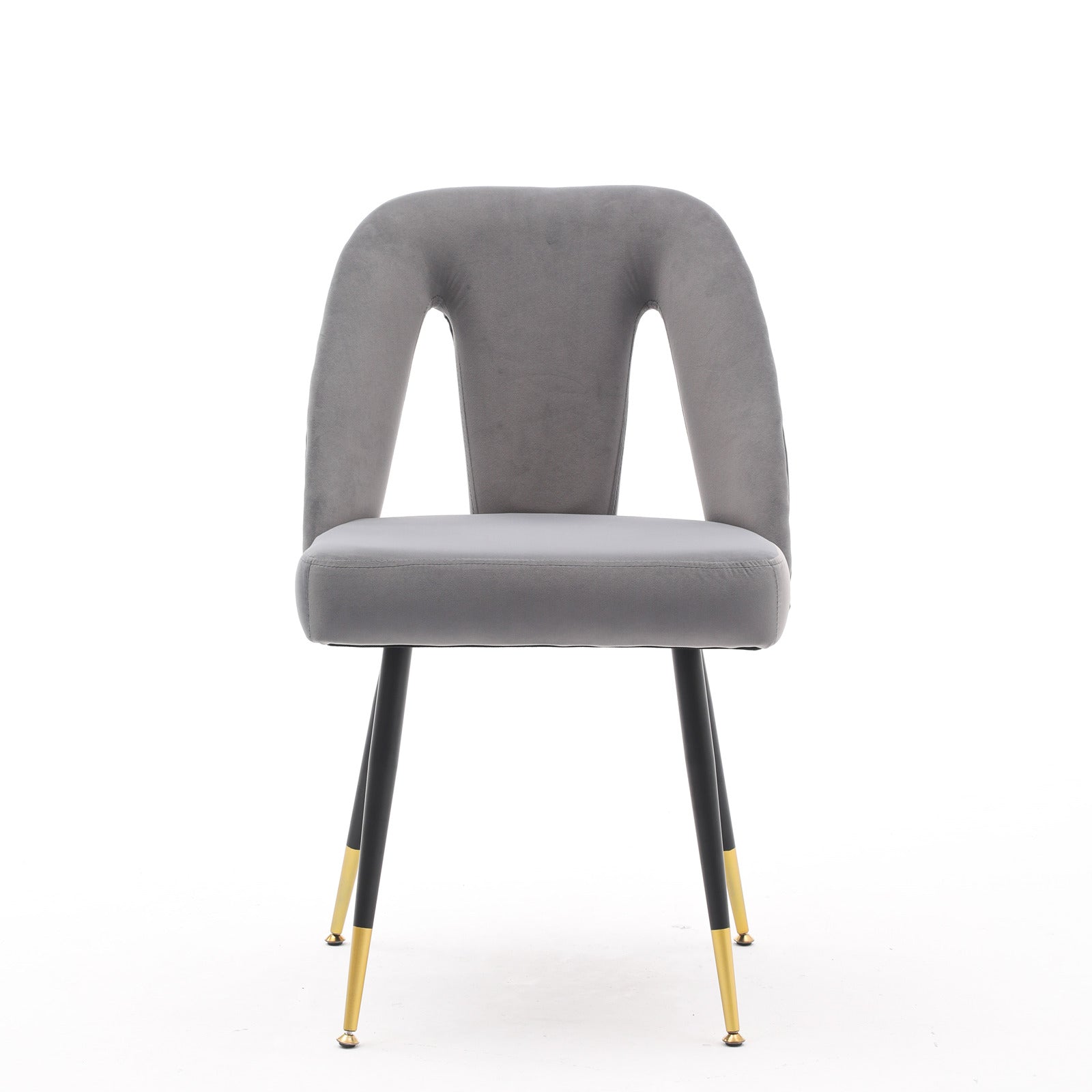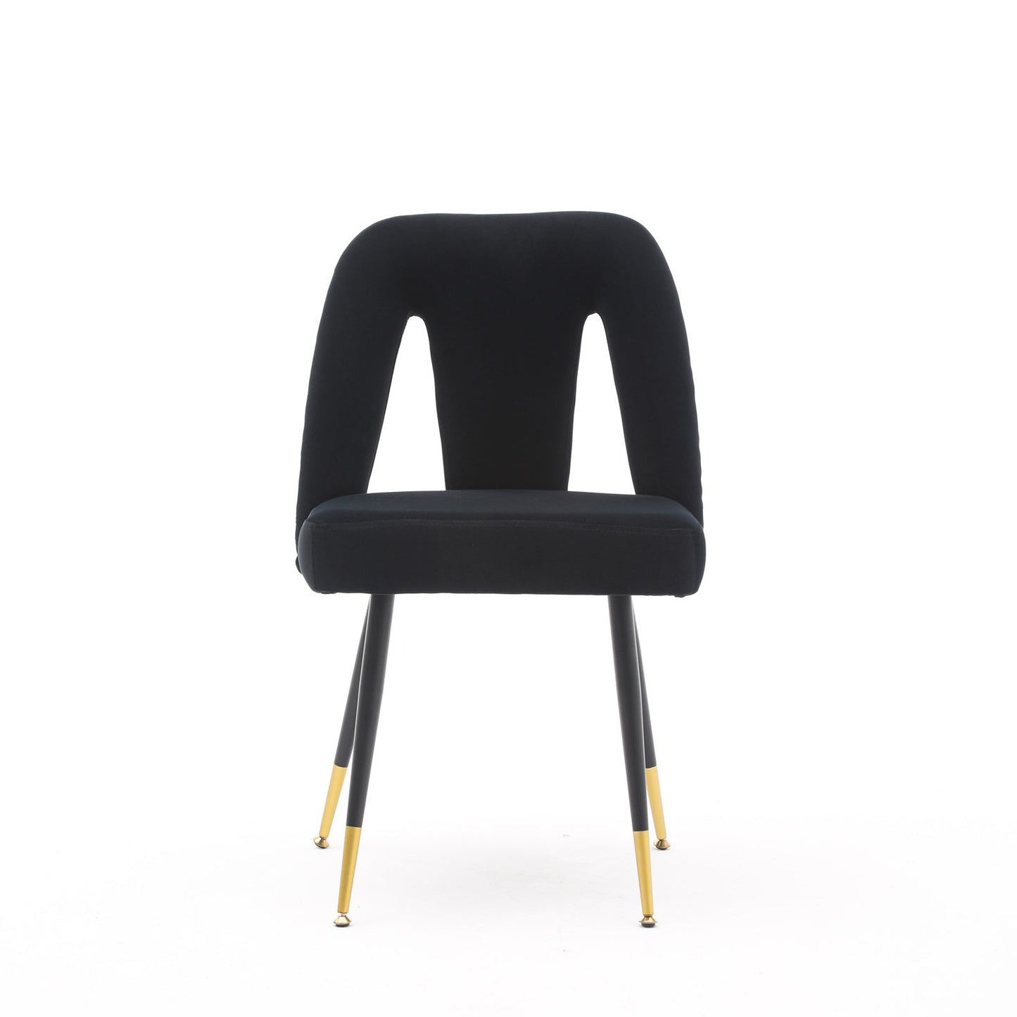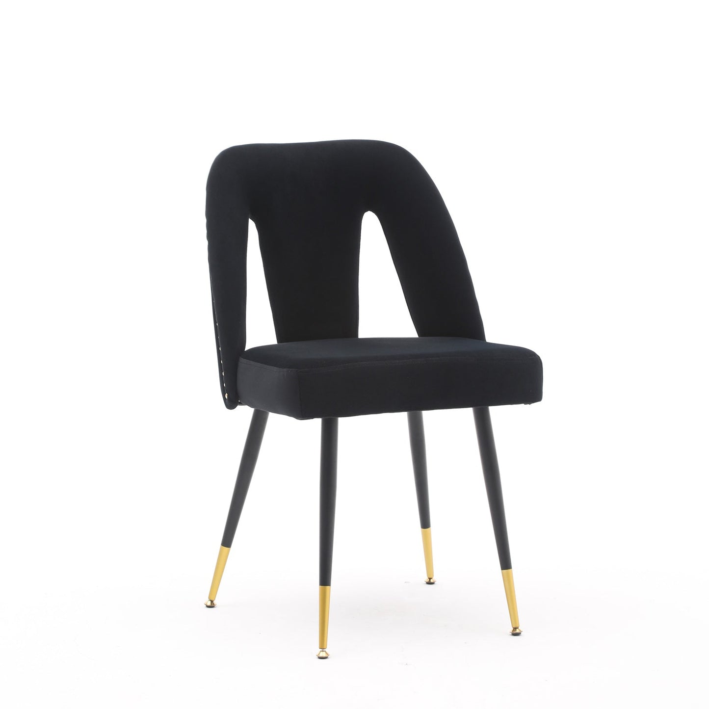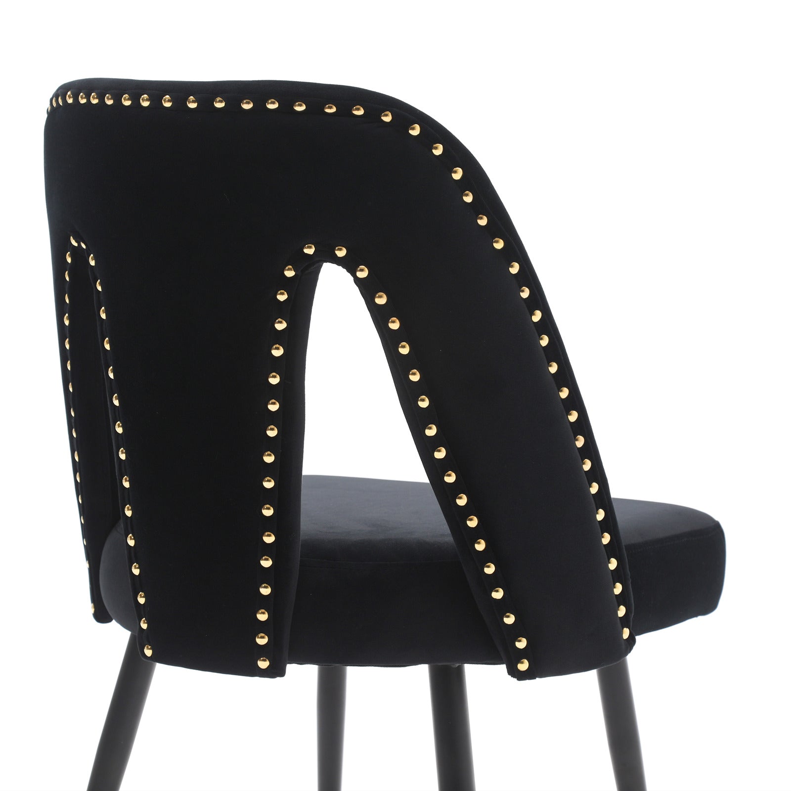 Designed with comfort and refinement in mind, each chair offers a plush velvet surface, high-density foam cushioning, and bold gold nailhead trim across the gently curved back. The black metal legs with gold-dipped tips provide contrast and glamour, giving these chairs a luxe designer feel.