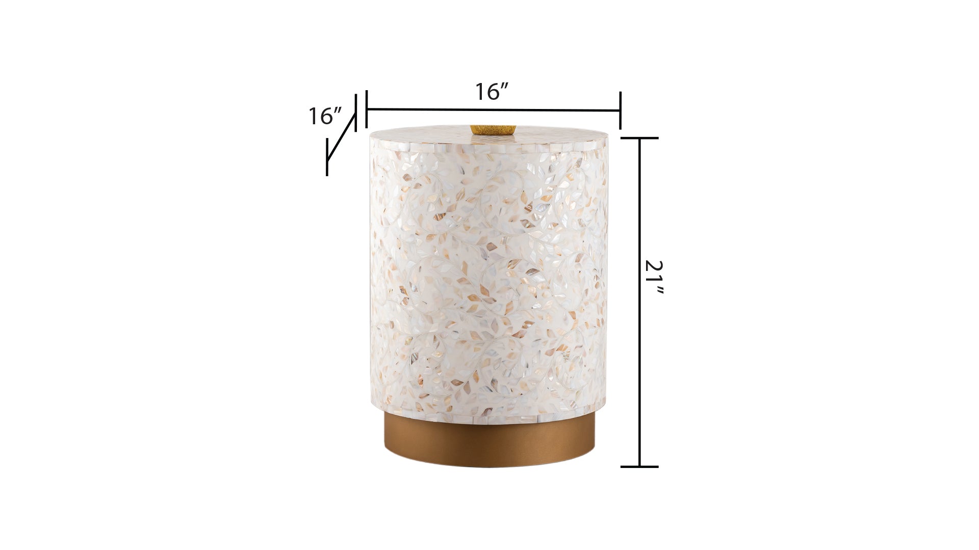 Elevate your living space with our exquisite end table, featuring a refined circular profile and a striking top available in shades of ivory. The table surface is adorned with enchanting floral patterns made from Capiz shells, exuding unique elegance. Its polished surface, complemented by a luxurious gold base, offers both beauty and practicality. Ideal for placement next to a sofa or armchair, this table serves as the perfect spot for stylish lamps, decor accents, or a convenient surface for your evening drink.