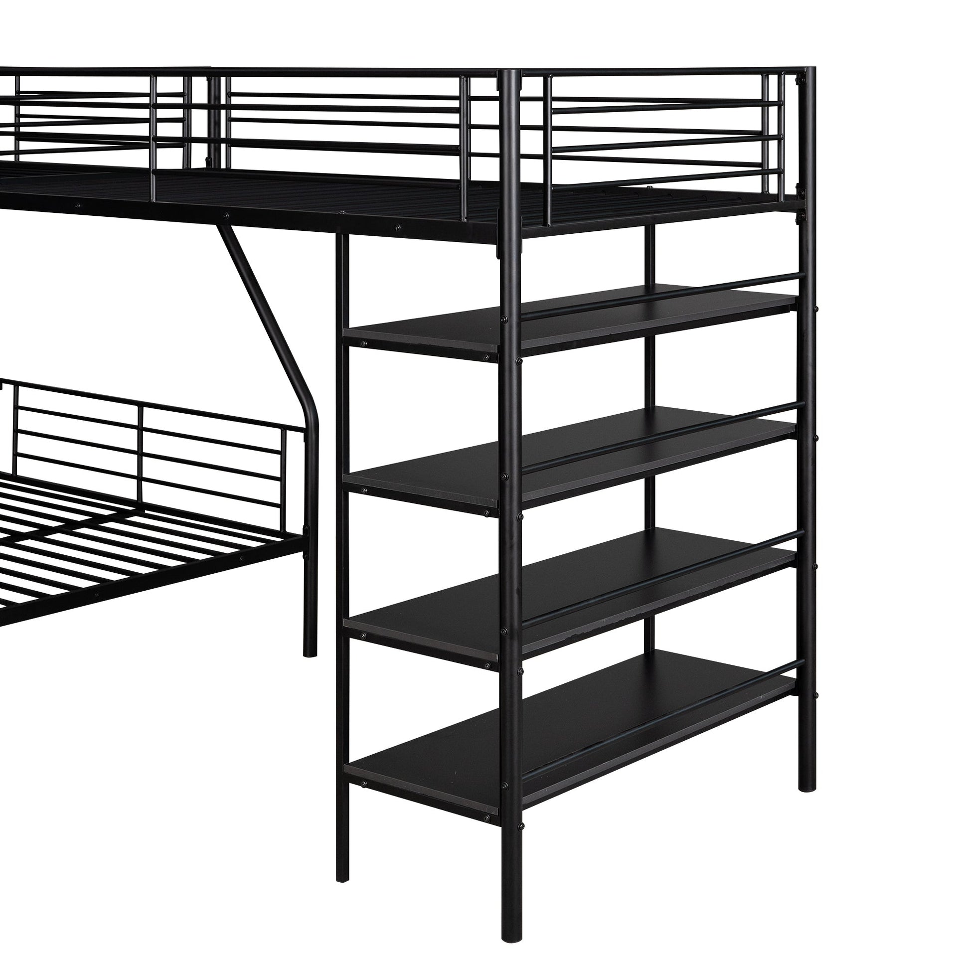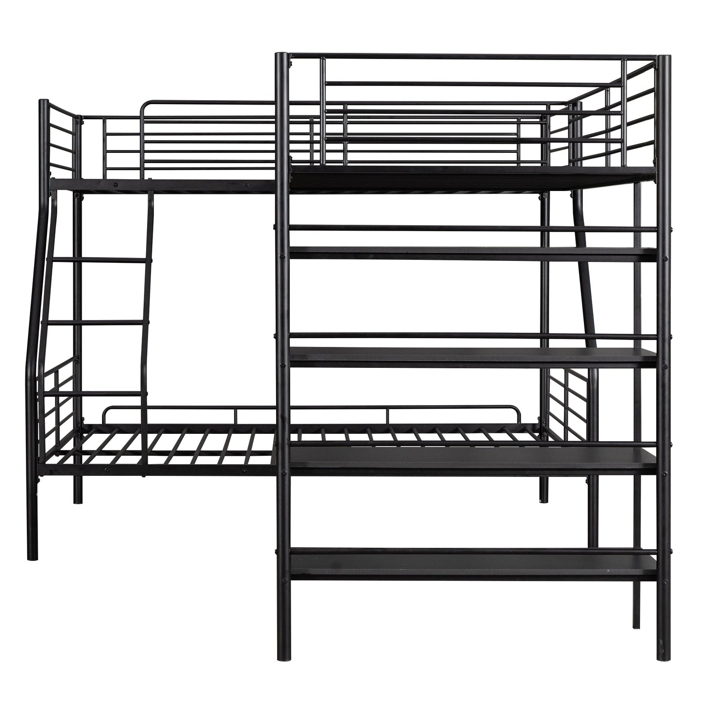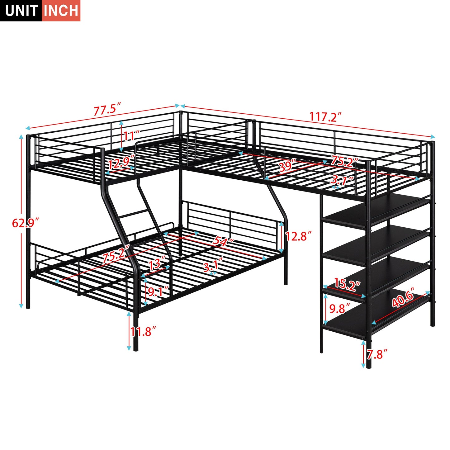 Maximize function and style with the WM Store L-Shaped Bunk Bed and Loft Combo, a versatile triple sleeper with space-saving design and integrated storage. This black metal bunk bed features a twin over full configuration on one side and a twin loft bed with four built-in MDF shelves on the other, forming an L-shaped layout ideal for shared bedrooms or guest spaces. Equipped with full-length guardrails for safety and sturdy slat support systems for all three beds, this piece eliminates the need for box springs while providing room for sleep, storage, and study all in one footprint. Perfect for modern families looking for flexibility without sacrificing floor space.