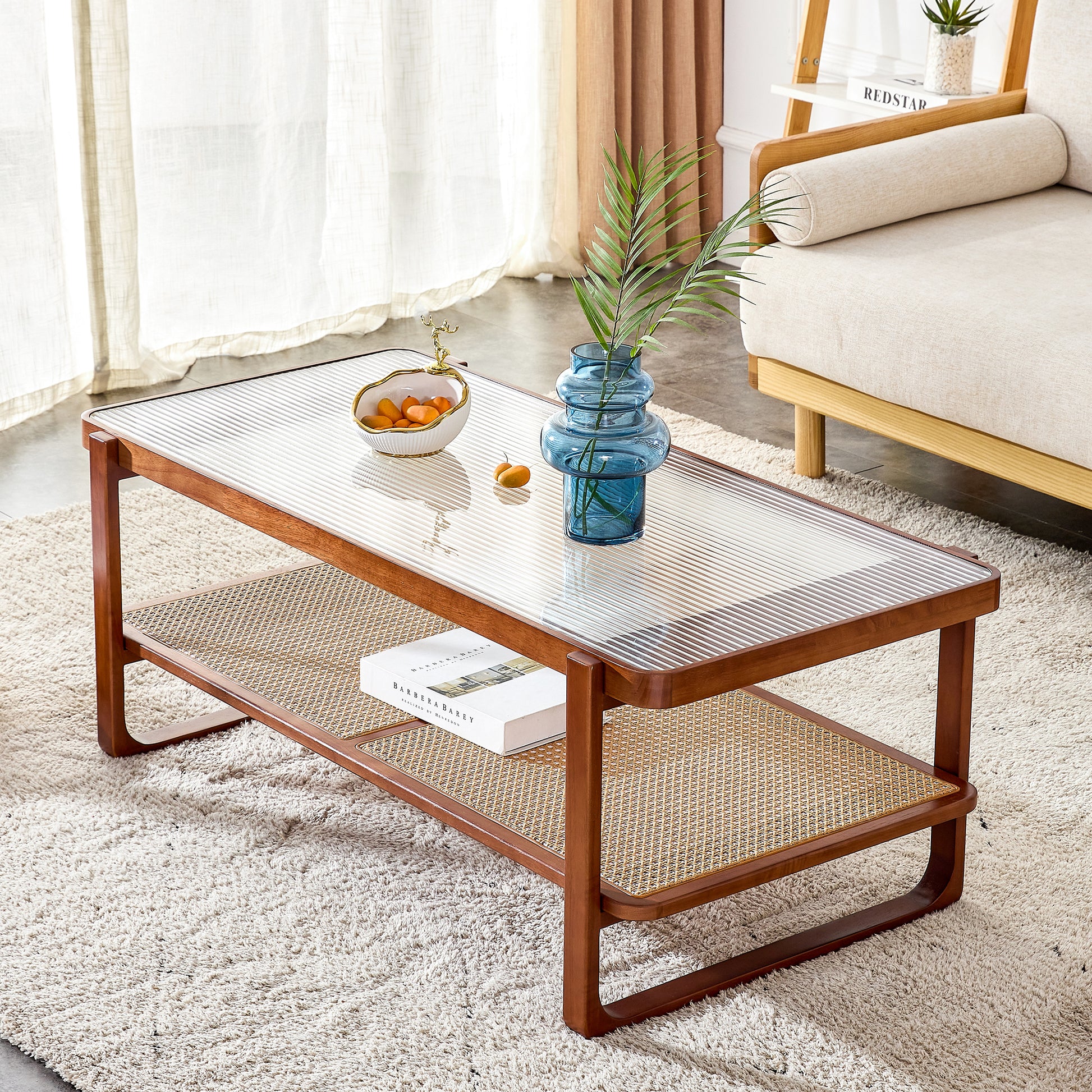 Baylor Mid-Century Modern Glass Top Coffee Table with Rattan Shelf, Walnut