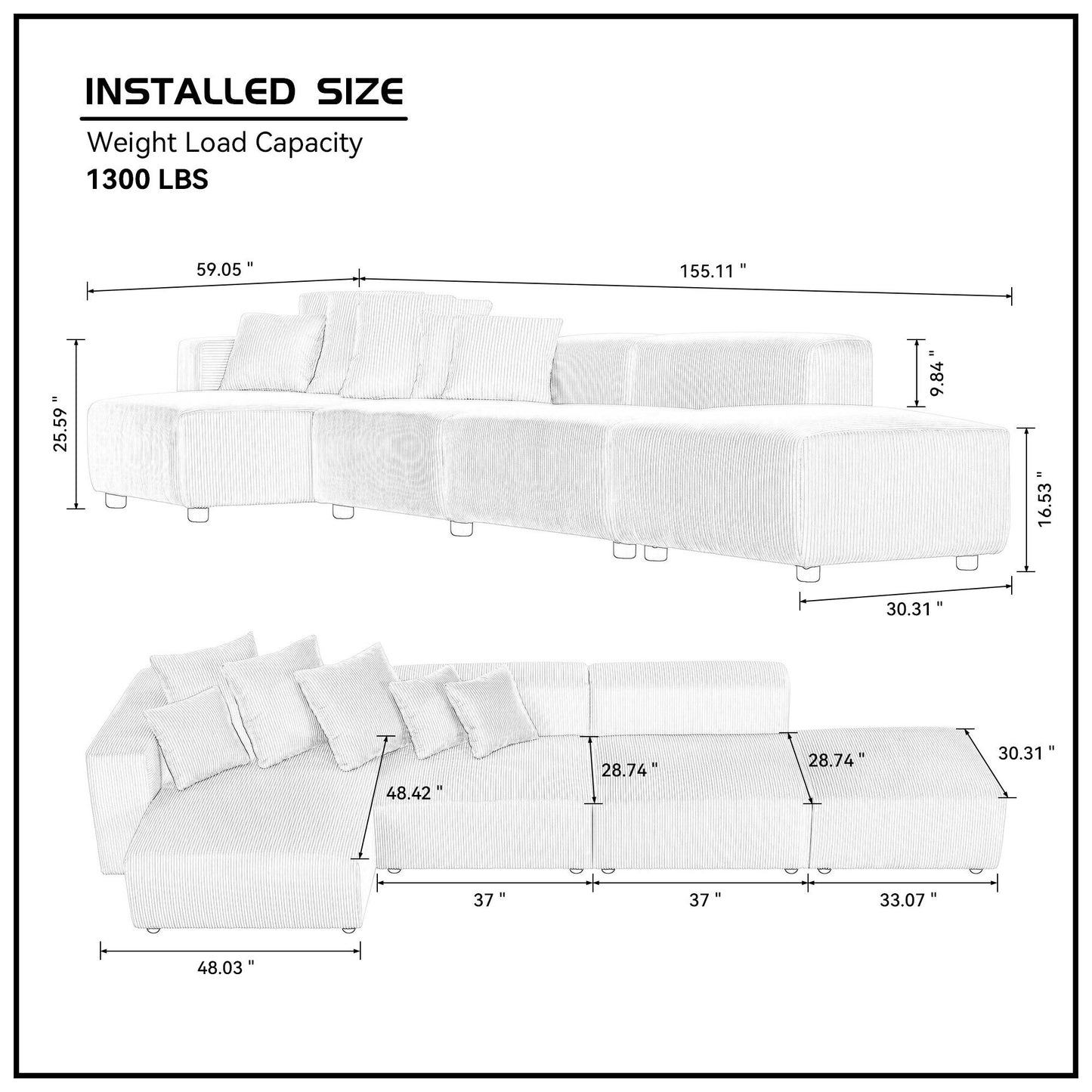 Modular 3-piece design includes chaise, armless chair, and ottoman; seats up to 4, comes with 4throw pillows(2 big and 2 small). The modern sofa couch measures W118.11 x D59.05 x H25.59. Compact furniture is ideal for small spaces.