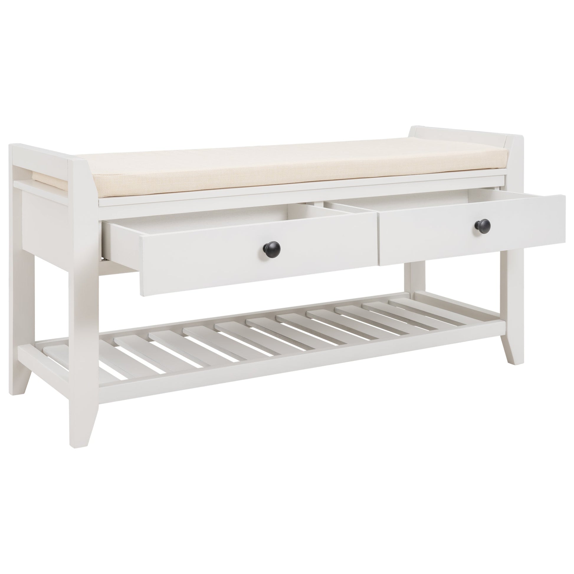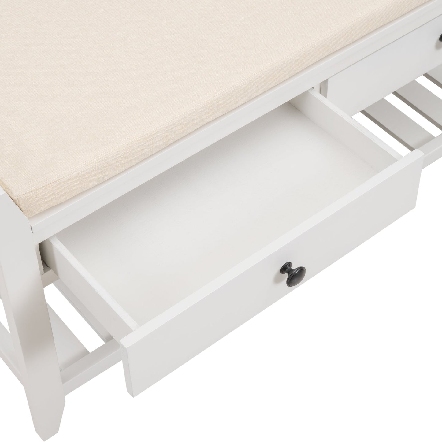 Transitional style entryway bench available in 5 colors with beige cushions seat. This beautiful storage bench has a low shoe rack and 2 upper drawers with round knobs.