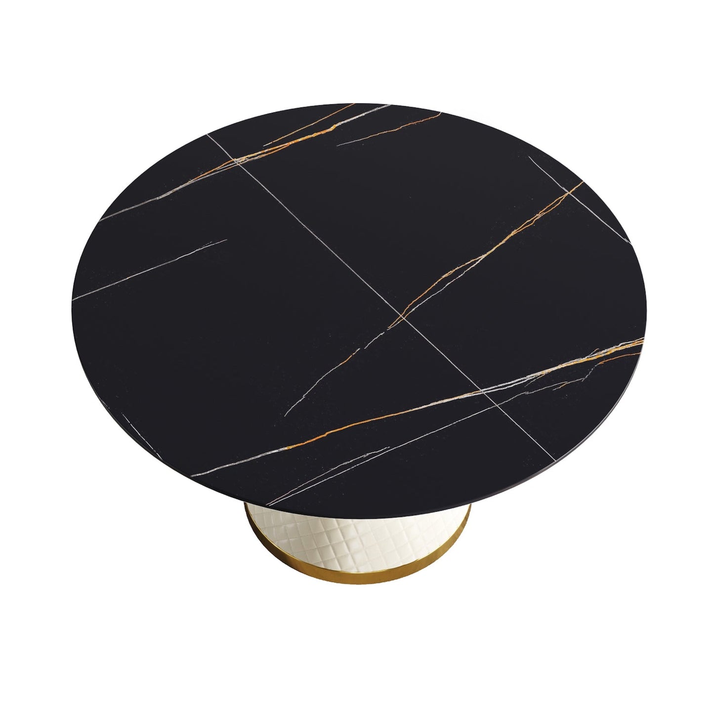Giving your dining area a modern update with this unique design by Atunus. This stunning table features a large 53.15" round black sintered stone top with a white and gold trimmed base.