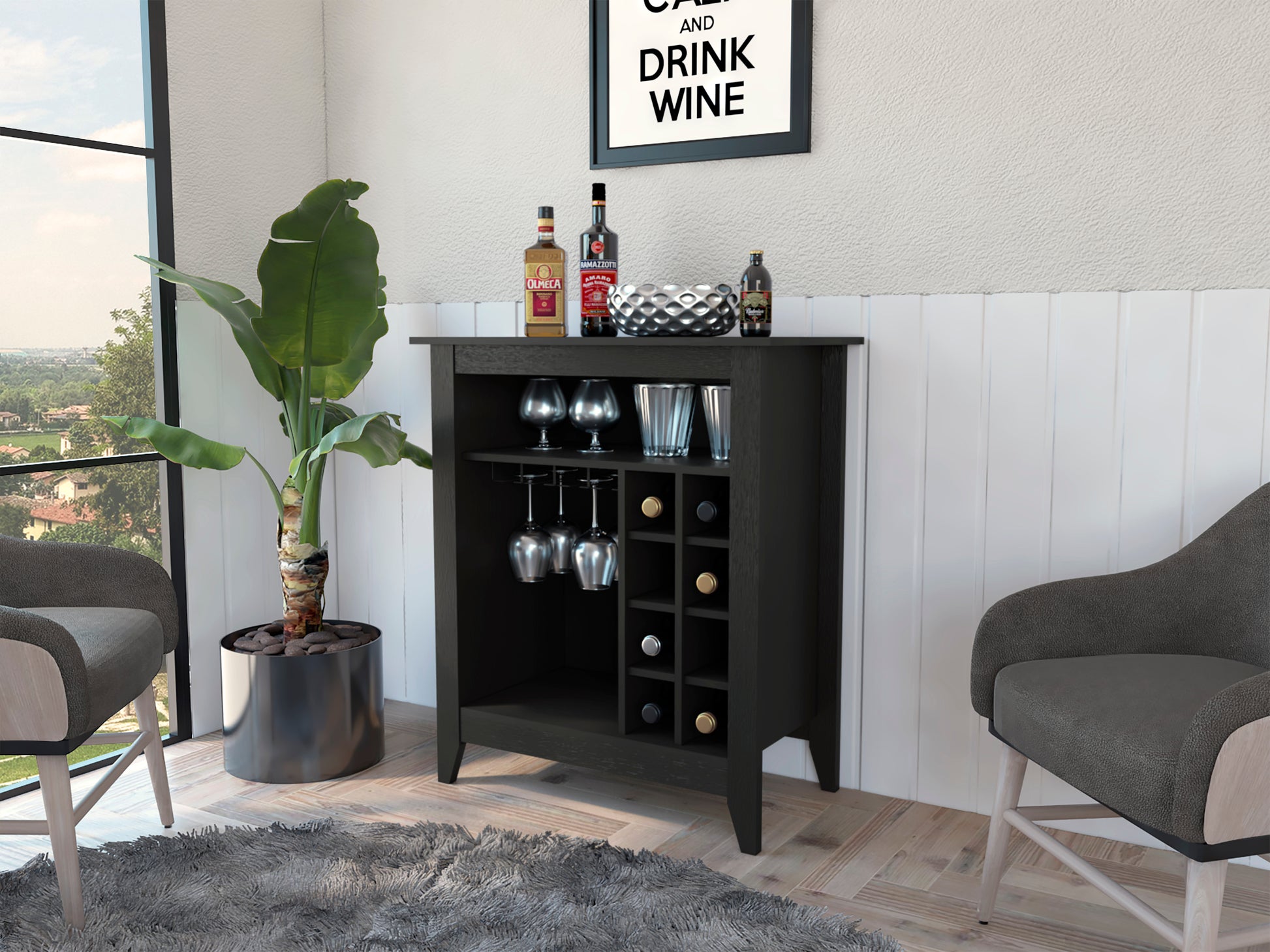 This unit is designed to hold up to 6 bottles, offering a compact and organized solution for storing your favorite wines or beverages, while a single shelf provides extra space for glassware or decorative items. The cabinet features a single drawer for convenient storage of smaller essentials, all finished in a black wengue combination that creates a modern, sophisticated look with a stylish, contemporary aesthetic that complements various décor styles.
