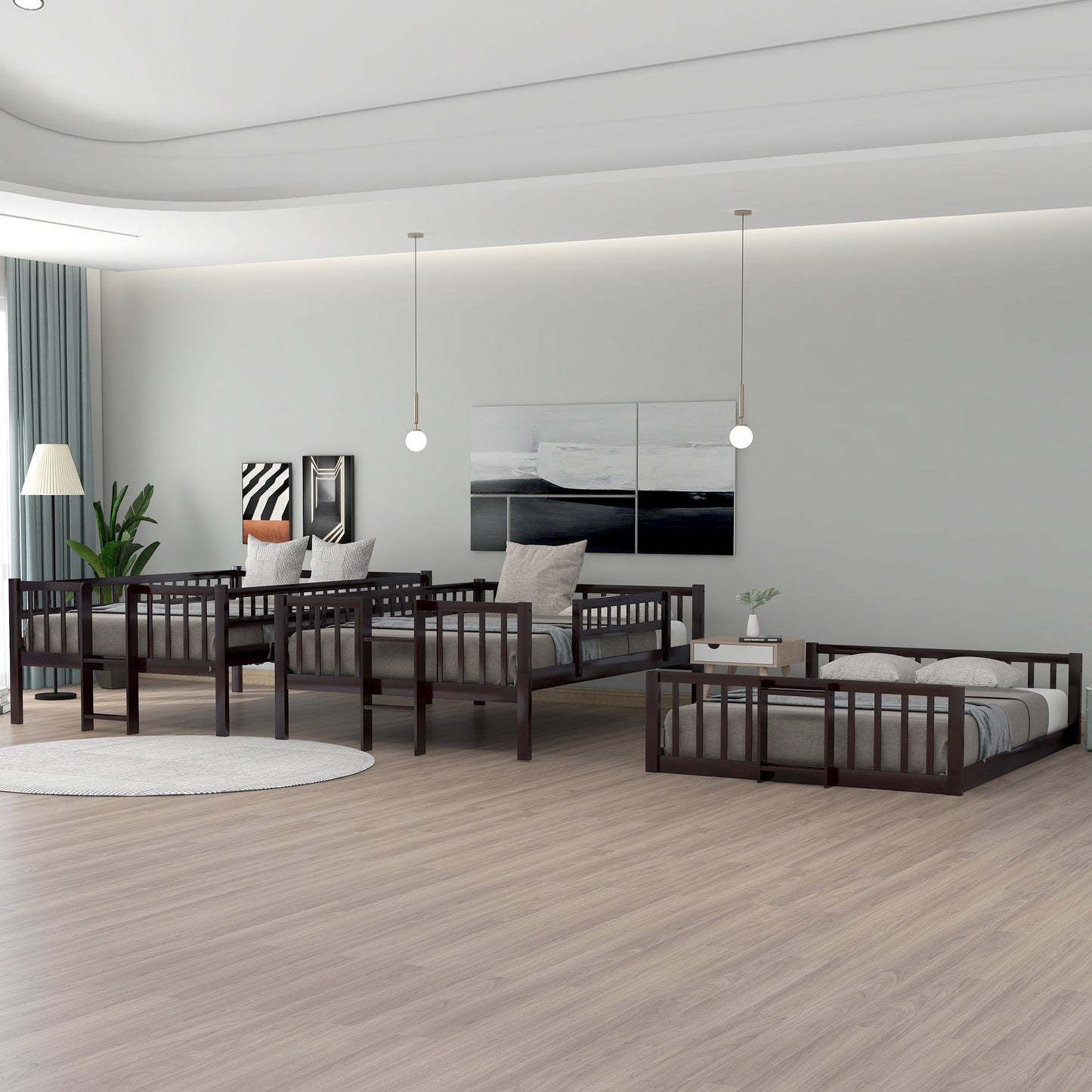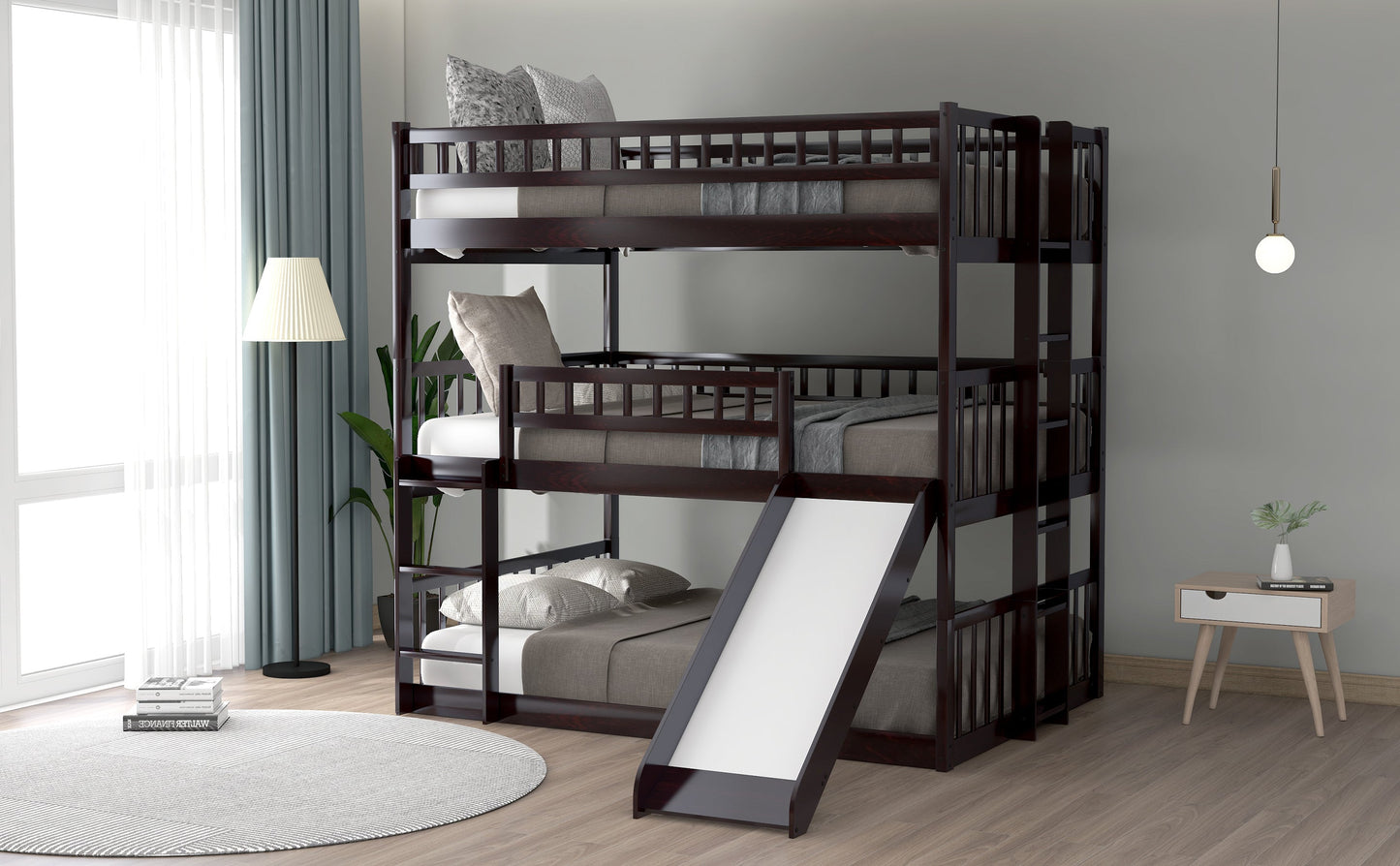 Featuring a full-over-full-over-full structure, this triple bed provides a convenient and flexible arrangement option for large families and sleepovers by taking advantage of vertical space. A gray finish enhances the smooth lines and add a contemporary feel to any room set aside for multiples to sleep. Crafted with pine wood and plywood, this triple bed is sturdy and durable to withstand the test of time. You can easily access the upper and middle bunks with two built-in ladders. Sturdy guardrails protect you as you sleep through the night. The specially designed slide can meet the play needs of you and develop you balance ability. This set works perfectly as a stacked full-over-full-over-full unit, or divided into three separate full beds. You can choose the combination method based on your own needs.