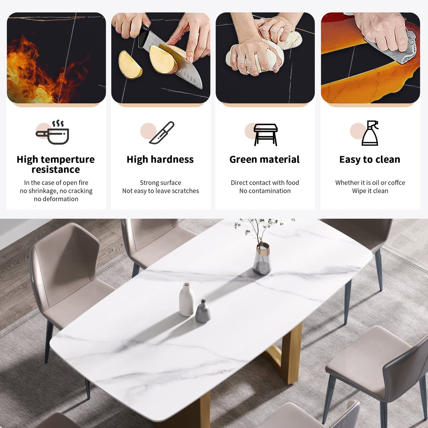 - [Rugged dining table panel & easy to clean] Rugged tabletop is another selling point. The 12mm thick desktop is made of sintered stone, which is heated and pressed into a blade shape, providing you with a desktop that can be used for many years. This material can prevent burns, stains and scratches, and has the characteristics of heat resistance, fire resistance and antifouling.
