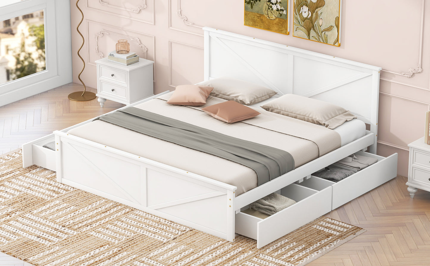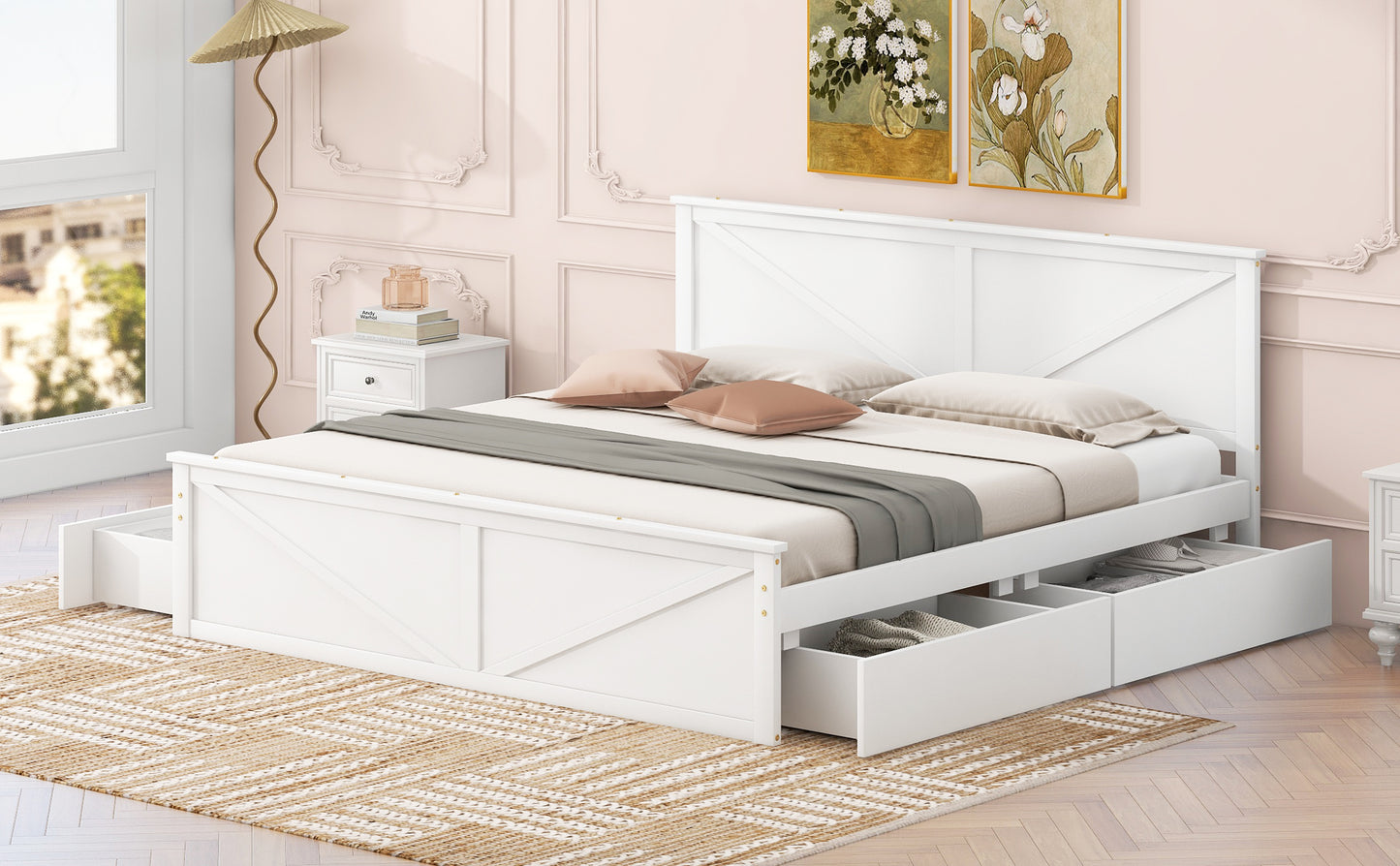 King Size Wooden Platform Bed with Four Storage Drawers and Support Legs, White