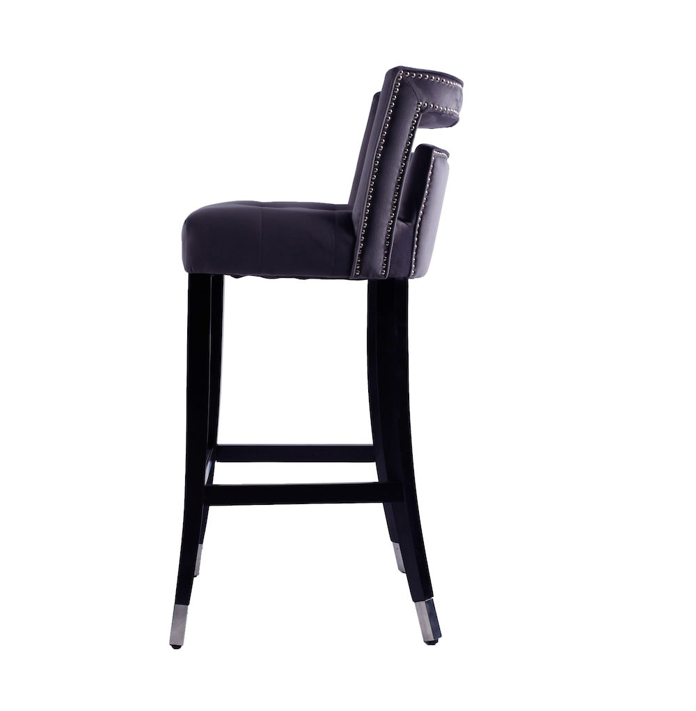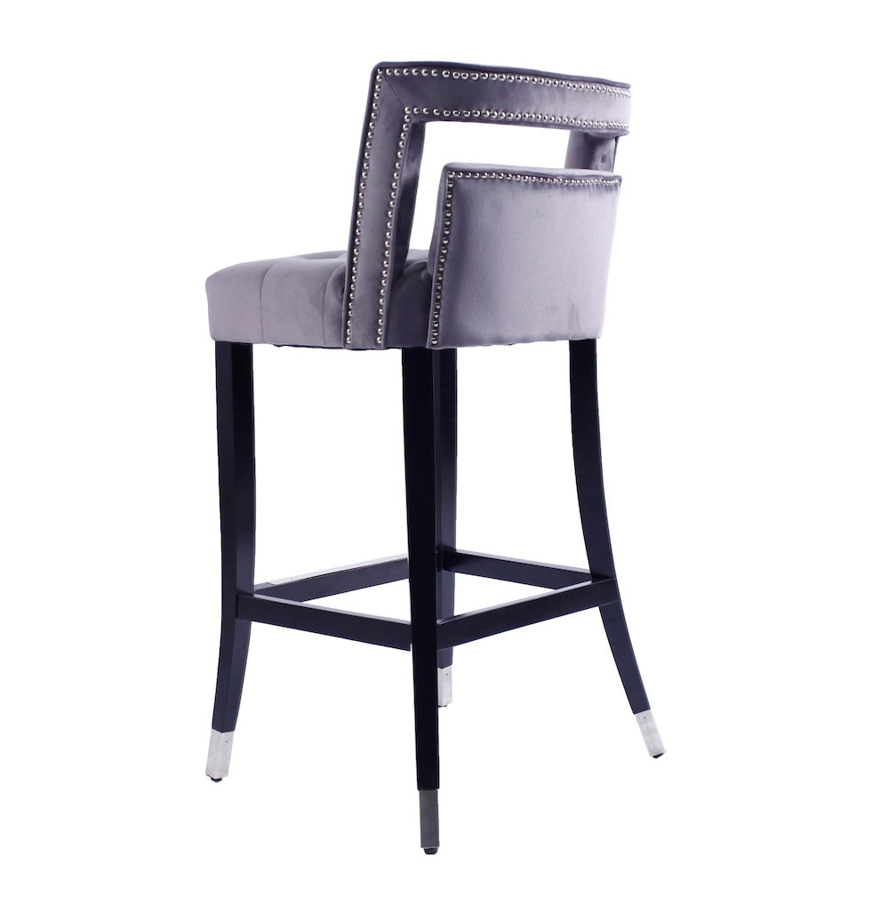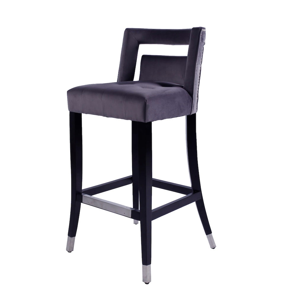 This bar stool set is upholstered in plush suede fabric with nailhead trim and black finished legs with chrome tips. Available in navy, cream, and gray. The combination of upholstery and details makes these counter height stools unique yet timeless pieces that will complement any décor.