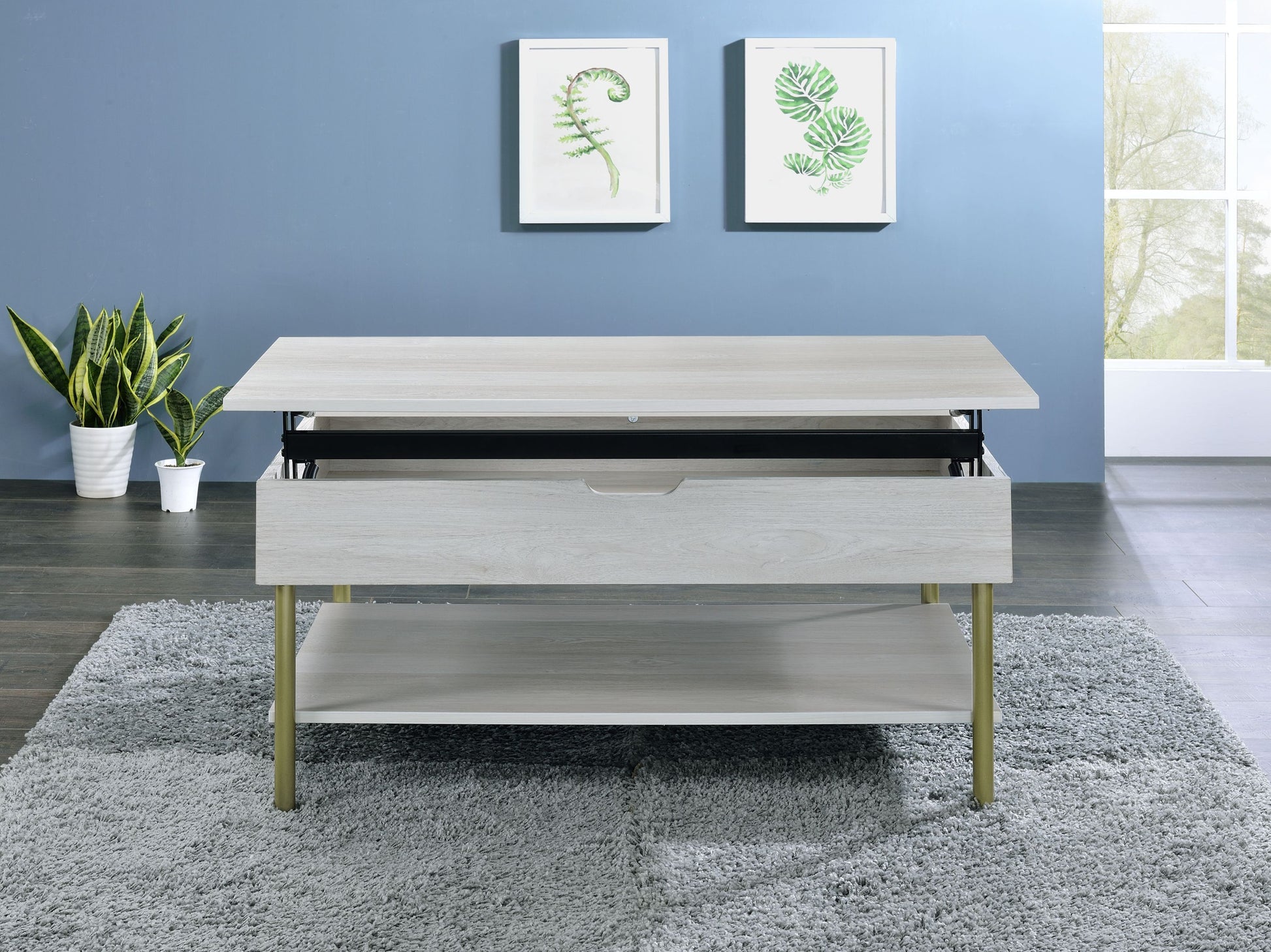 Whitman Lift-Top Coffee Table with Storage Shelf & Satin Brass Legs – White